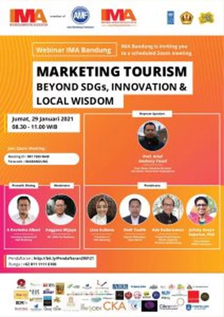 Hal tersebut disampaikan Presiden IMA (Indonesia Marketing Association) Bandung Dr Lina Aulina dalam Webinar yang berjudul MARKETING TOURISM : BEYOND SDGs, INNOVATION & LOCAL WISDOM (29012021). Hadir pula dalam webinar tersebut pimpinan ASITA, PHRI, pengurus IMA Bandung, mahasiswa dan para pelaku pariwisata dan UMKM serta dipandu moderator Anggasa Wijaya.