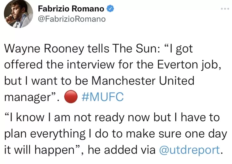 "Saya mendapatkan tawaran wawancara dari klub Everton, tapi saya menginginkan untuk dapat menjadi manajer Manchester United" ungkap Wayne Rooney.