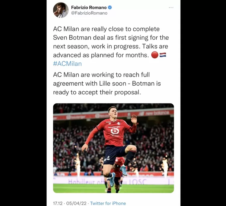 "AC Milan telah mendekati kesepakatan secara keseluruhan dengan Sven Botman sebagai rekrutan pertama untuk musim depan" tulis Fabrizio.