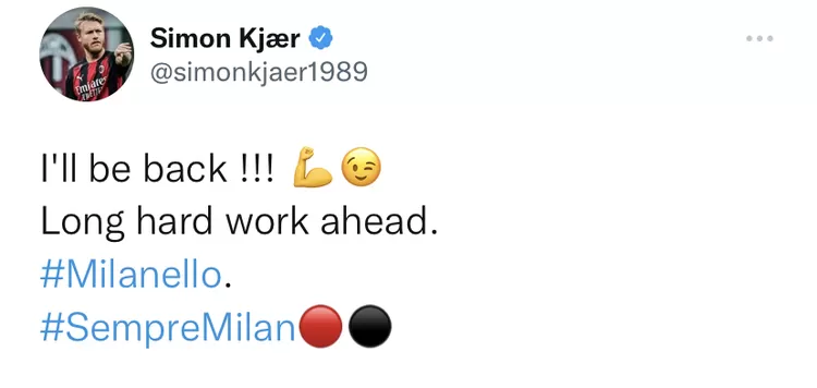 "Saya akan kembali!! Kedepan akan menjadi kerja keras yang panjang" tulis Simon Kjaer.