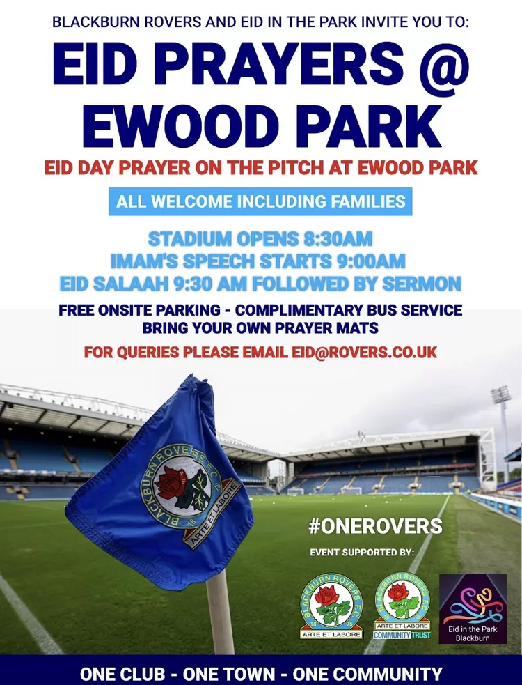 Khusus tahun ini, klub yang kini di peringkat 9 divisi dua Liga Inggris itu mengundang umat muslim shalat Ied di markas Blackburn Rovers.